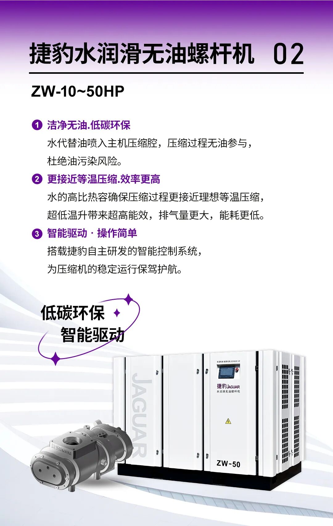 目前,捷豹ZW水润滑无油螺杆机、捷豹ZBS无油螺杆鼓风机、捷豹SV无油涡旋机等产品,已成熟应用于冶金、医疗、食品、新能源、锂电池、化学、污水处理厂等行业,节能性能凸出,经久耐用,纯净无油的输出气体,助力各个行业高速发展。